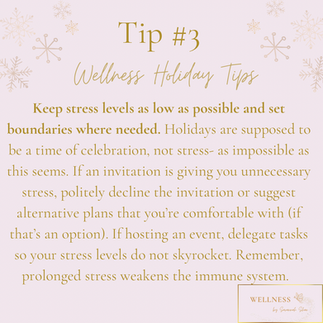 Keep stress levels as low as possible and set boundaries where needed. Holidays are supposed to be a time of celebration, not stress- as impossible as this seems. If an invitation is giving you unnecessary stress, politely decline the invitation or suggest alternative plans that you’re comfortable with (if that’s an option). If hosting an event, delegate tasks so your stress levels do not skyrocket. Remember, prolonged stress weakens the immune system.